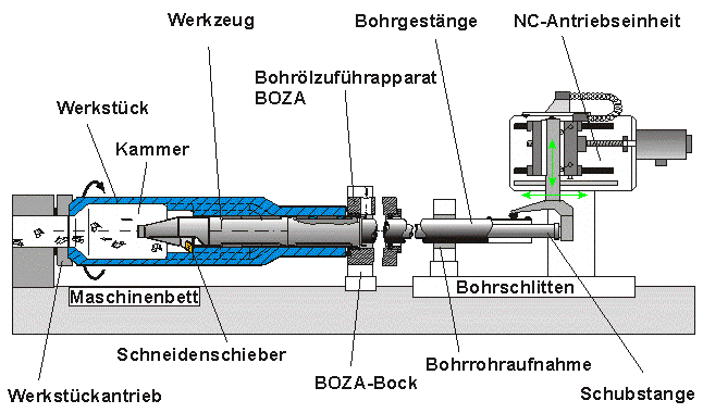 Ein “Verwandtes Verfahren der Tiefbohrverfahren”. Hier die technische Realisierung von Kinematik, Maschine und Werkzeug etc. zur Fertigung einer Auskammerung.