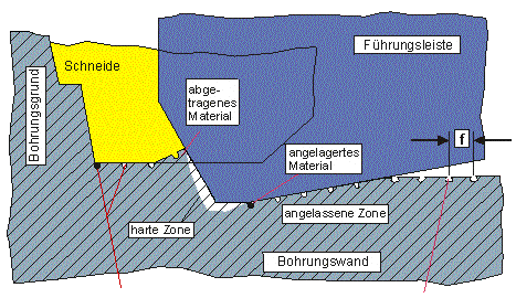 vorgeschoben wird, so dass sich ein Wall bildet. Dieser wird durch die Rundschliffase der Schneide (Nebenschneide) zerspant. Erst unter den Führungsleisten entsteht die nach dem Bohrvorgang messbare Rauheit. Durch