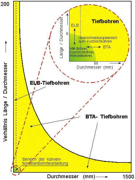 Das gesamte Feld der durch Bohren herstellbaren Innenkonturen wird durch die Tiefbohrtechnik beherrscht. Lediglich im Bereich kleinerer Bohrtiefen (bis Länge/Durchmesser ca. 6 und Durchmesser bis ca. 60 mm) werden auch andere Bohrverfahren und Bohrwerkzeuge eingesetzt.